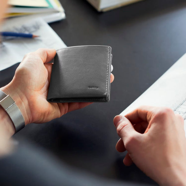 A traditional design with surprising storage, the Note Sleeve holds cards, bills and coins in a trim, professional billfold.