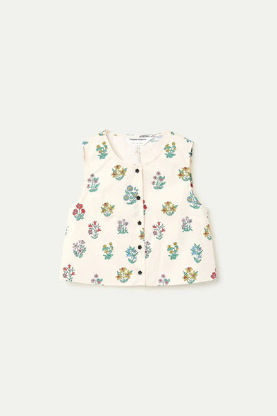 Top made from 100% cotton with a gardener print. Round neck and sleeveless. Front closure with decorative flower-shaped buttons. The model is 177 cm tall and wears size S.