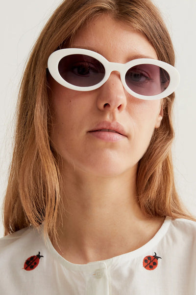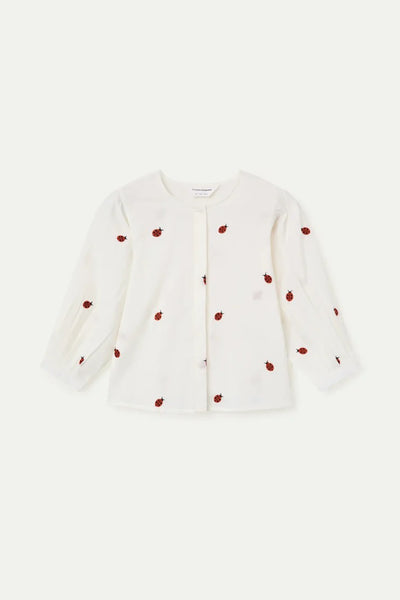 White 100% cotton shirt with a ladybug print. Round neck and slightly puffed long sleeves. White button-front closure. The model is 177 cm tall and wears size S.