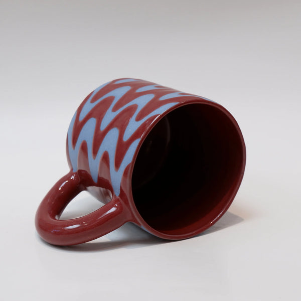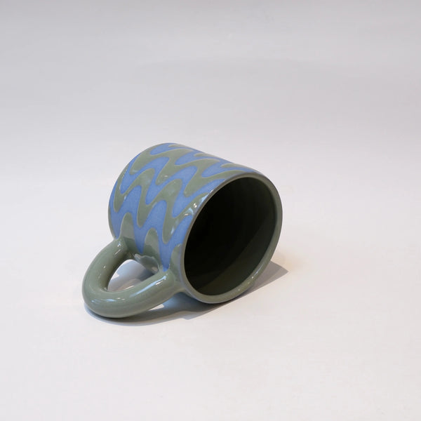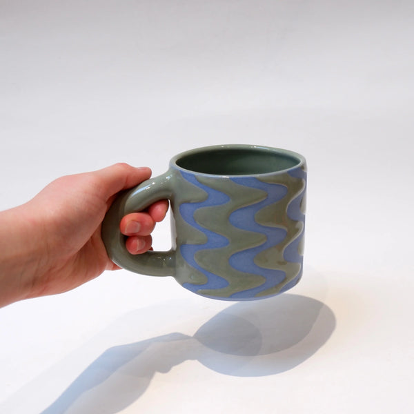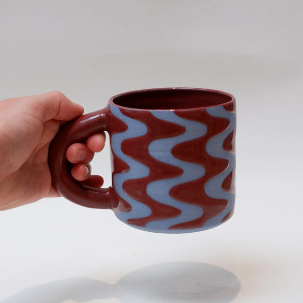 The Rave mug came from experimenting with patterns and playing around with new technology. They are made from porcelain that we colour by us using mason stain. This mug has a unique pattern that I designed and cut into vinyl. When adhered to bisqueware, it acts as a resist for the glaze. I love playing around with colour to create satisfying combinations!