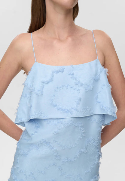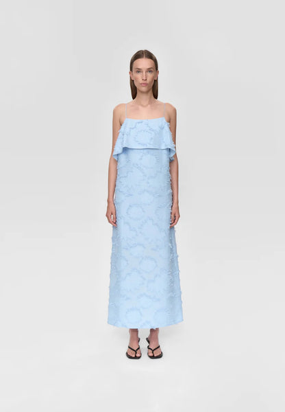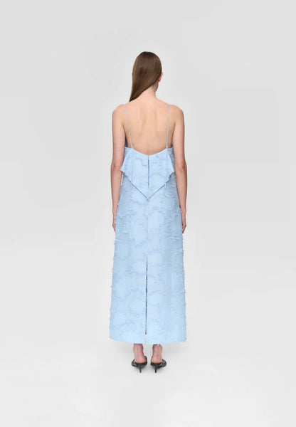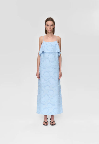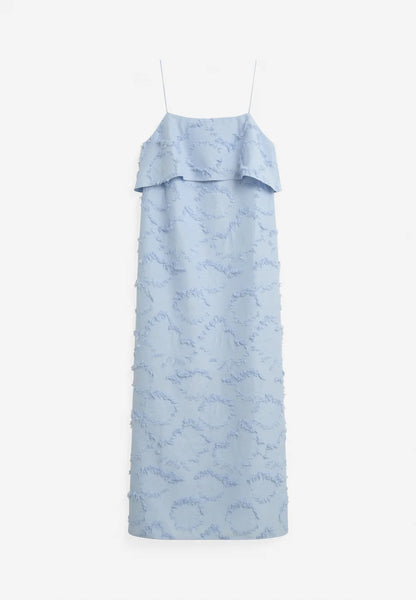 This elegant dress features a clean, minimalist design with a straight silhouette. Made from a flower fringed jacquard fabric featuring round, adjustable shoulder straps and a draped detail at back. Elevated details makes it comfortable yet stylish for both casual outings and special occasions.