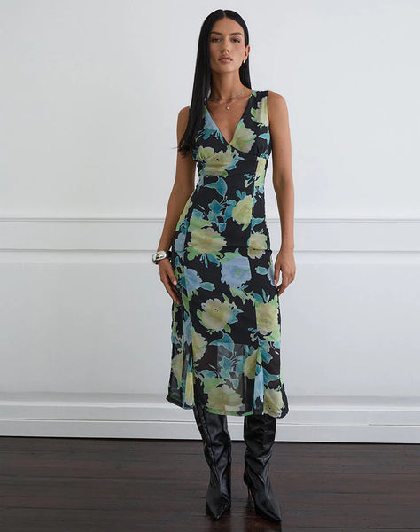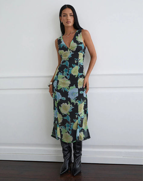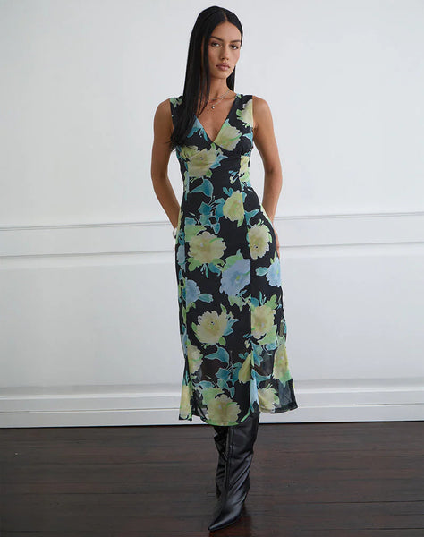 The Olydia dress is crafted in black chiffon with crystal flower print. It features a midi length, deep V-neckline, fitted waist, and a soft fluted hem.