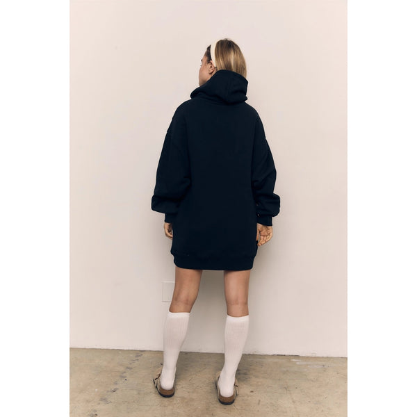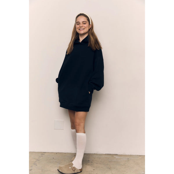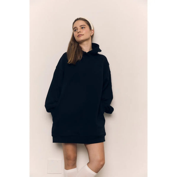 Elevate your brand's presence with this premium organic cotton hoodie dress, designed for boutiques that prioritize sustainable, high-quality loungewear. Crafted from a heavyweight 435 GSM 100% organic cotton terry, this dress offers a substantial and durable feel while remaining breathable and soft. The long, clean silhouette features a loose, relaxed fit for all-day comfort and effortless styling. This piece is a versatile transitional essential that moves seamlessly between seasons. Functional side pockets add a practical element to the minimalist design.