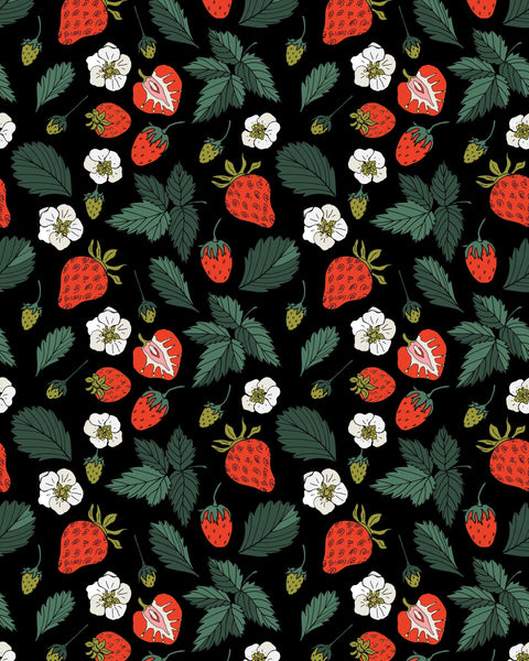 The Strawberry Fields Print is a charming and nostalgic design featuring ripe strawberries, delicate white blossoms, and rich green foliage set against a striking black background. With its hand-drawn details and vintage-inspired aesthetic, this print celebrates the sweet simplicity of nature and countryside elegance.