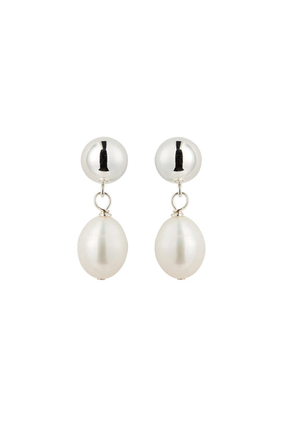 A classic drop earring featuring a sphere stud accented by beautiful, one of a kind, oval Fresh Water Pearls.