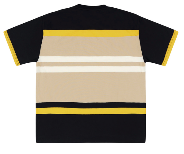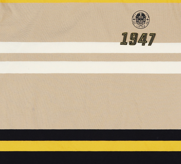 The LRG Genetics striped crew neck knit tee. Contains classic 1947 messaging on a striped Black, GOld and Tan Field.