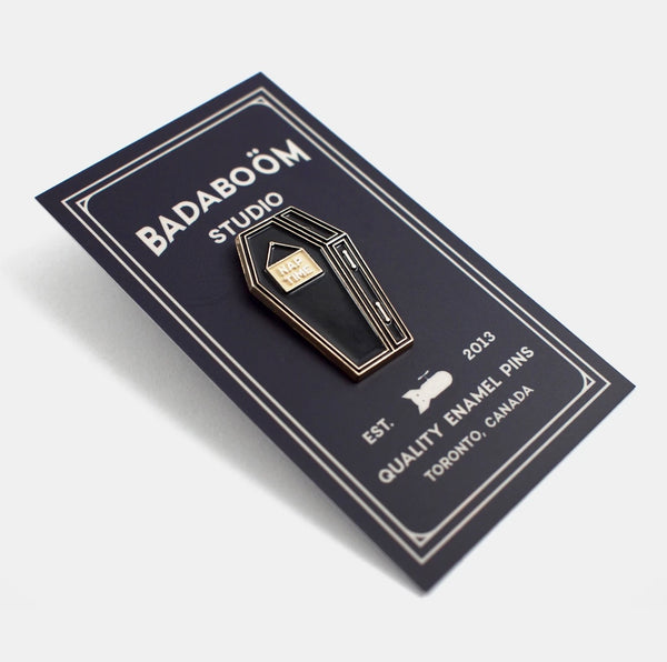 Soft enamel pin with gold outline, backing and rubber clutch.