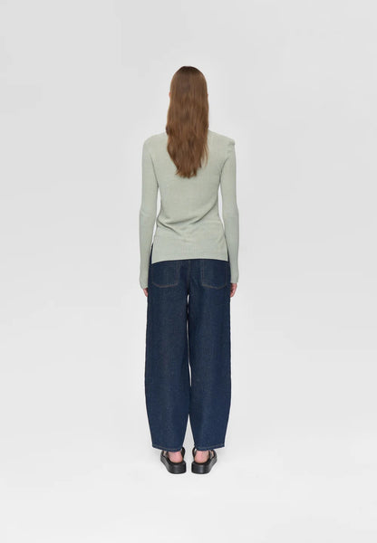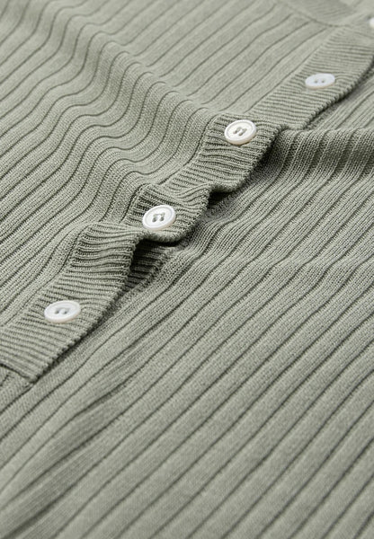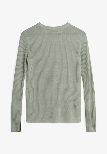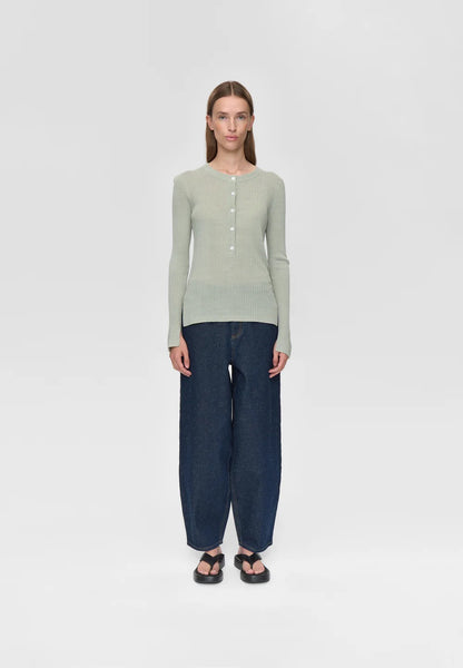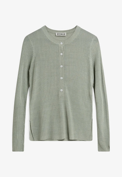 Elegant yet casual long sleeved knitted jumper. Featuring henley closure at front with button closure and slits at sleeve hem. Delicate viscose yarn in a classic rib design.