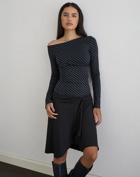 The Hoang top in an ocean storm oblique stripe print on rayon jersey fabric base. Long sleeve style top with off-the-shoulder neckline, under bust ruching and deep waist panel.