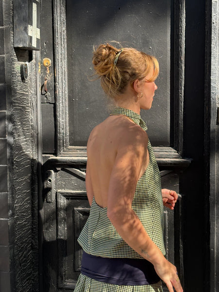 Plaids & Stripes: Body made from dead stock plaid fabric, 100% unknown fibres, waist band made from 95% Bamboo, 5% Spandex