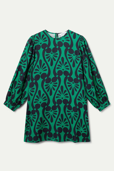 Short dress with a Baroque print. Round neckline and long French sleeves. Button closure at the back. The model is 179 cm tall and is wearing a size S.