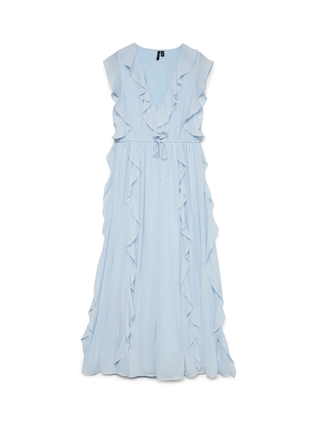 - Product Type : Dress - Neck : V-Neck - Sleeve : Sleeveless - Length/Size : Ankle length - Extra details : Frills, Belt in waist - Fit : Regular Fit