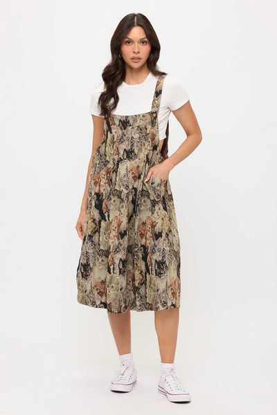 Showcase your love for felines with our captivating Cat Collage Print Dress! This incredibly unique and charming midi-length dress features a dense all-over print of various cats, illustrated in a realistic style, creating a striking visual collage. The cats are rendered in natural fur colors against a dark background. Made from a comfortable, durable fabric, this overall-style dress offers a relaxed fit, complete with adjustable shoulder straps, a front bib, and convenient large patch pockets. Perfect for layering over a favorite tee, this dress is a versatile and distinctive addition to any cat enthusiast's wardrobe!
