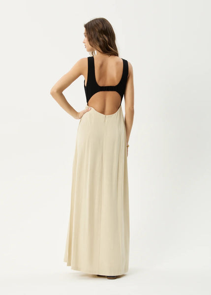 Introducing the 'Charlotte' maxi dress in a relaxed silhouette. Made from a heavyweight linen-viscose blend with a crepe texture, it includes a contrast bodice with self fabric lining, side seam pockets, and panel detailing for subtle shaping. Finished with a flattering cut out back, an encased elastic strap, and invisible centre back zip.