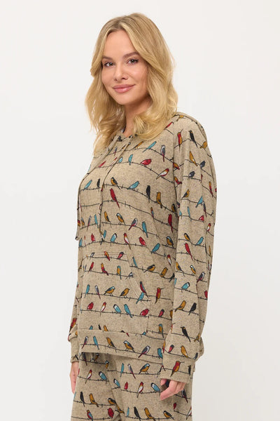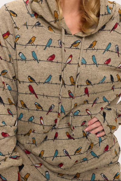 Bring a cheerful melody to your wardrobe with our Colorful Chirpy Birds Print Tunic Hoodie! This wonderfully cozy hooded pullover features a vibrant all-over print of various stylized birds, each depicted in a delightful array of bright colors like red, blue, green, and yellow, appearing to chirp happily from their perches. The cheerful avian friends stand out beautifully against a soft, heathered background. Crafted from a comfortable, soft material, this tunic hoodie offers a relaxed, elongated fit, complete with a cozy hood, a convenient front kangaroo pocket, and ribbed cuffs and hem. Perfect for adding a touch of whimsical nature to your casual style.