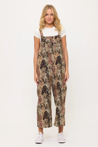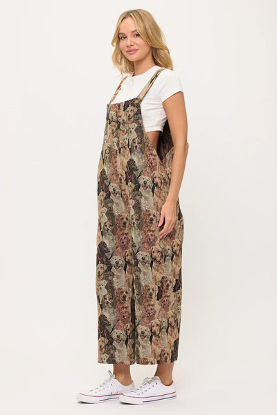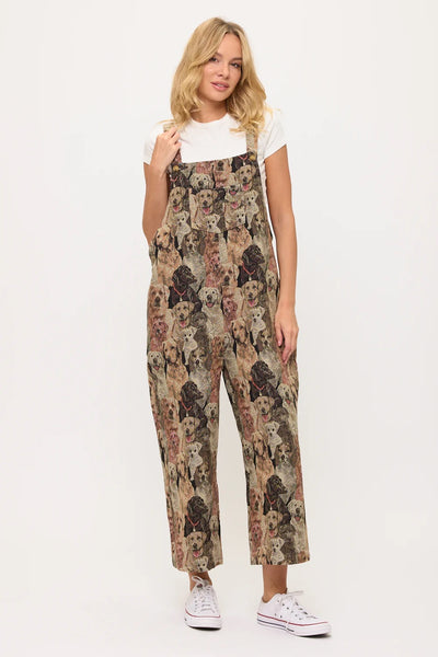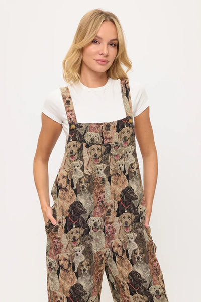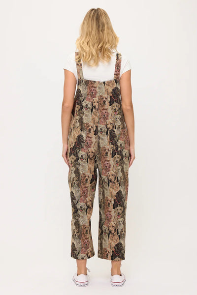 Show your true canine devotion with our incredibly detailed Dogs Collage Print Overalls! These wonderfully comfortable overalls feature a dense, all-over print composed of countless different dog faces, intricately arranged to create a captivating tapestry effect. The realistic and expressive dog portraits showcase a multitude of breeds and fur textures in a rich, multi-tonal palette of browns, tans, greys, and creams, giving the print remarkable depth. Crafted from a soft, plush fabric, these overalls offer a relaxed fit, complete with adjustable shoulder straps for a personalized feel, a convenient front bib pocket, and practical side pockets. Perfect for layering over your favorite top, these versatile overalls are ideal for expressing your deep love for dogs, casual outings, or adding a truly unique and artistic piece to your everyday comfort wear!