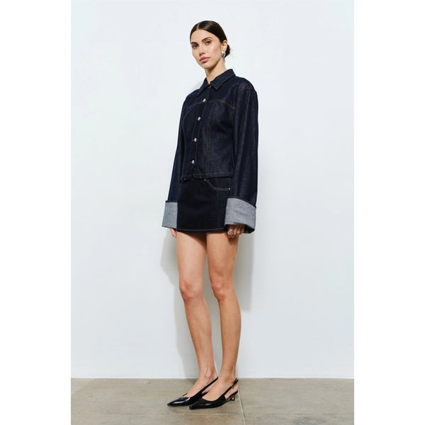 The Dorothy jacket in indigo denim exudes a streamlined elegance, featuring a fitted bodice and distinct wide cuffed sleeves. Silver button detailing across the front brings a hint of modern shine, balancing timeless structure with an modern appeal.