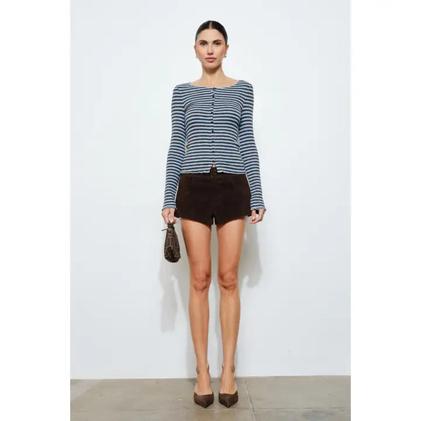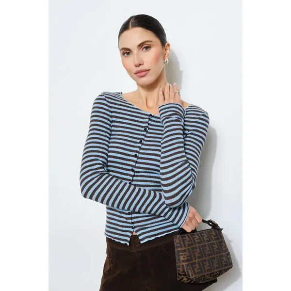 The Dree top offers a playful update to the classic long sleeve with its delicate lettuce-edge trims at the cuffs and hem. Crafted from soft ribbed knit in a timeless striped pattern, this fitted button-down features a flattering scoop neckline.