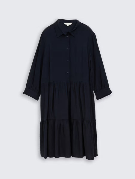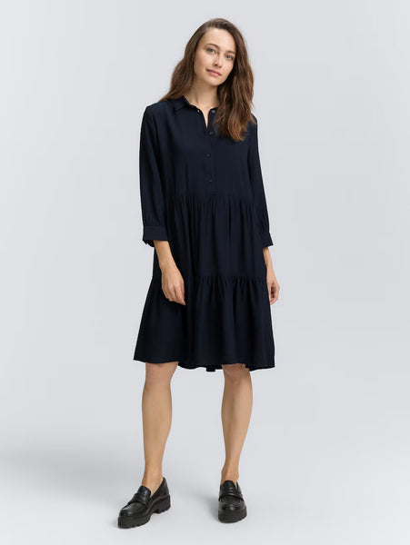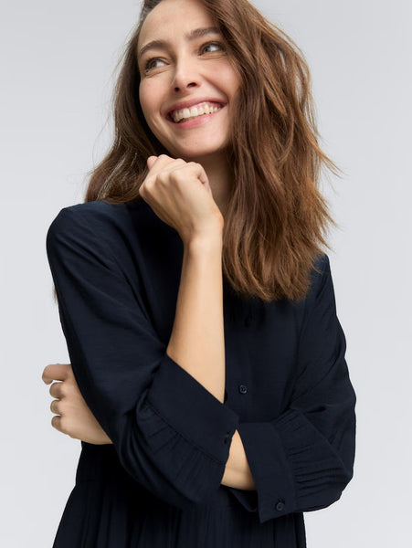 • Crinkle-look blouse dress with flounces. With 3/4-length sleeves, collar and half button fastening.