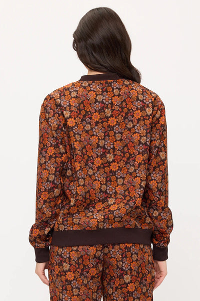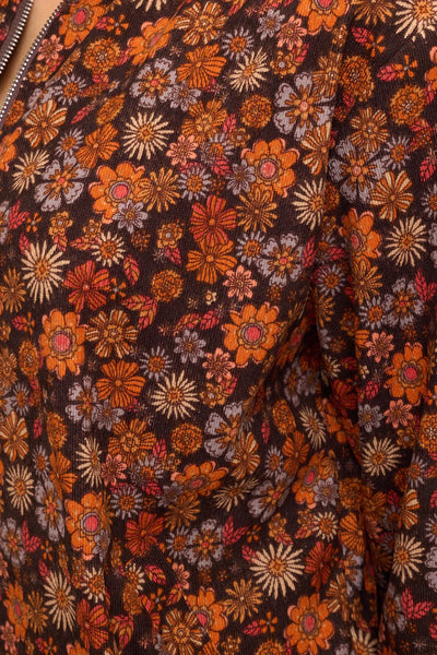 Embrace the cozy spirit of autumn with our Fall Floral Print Corduroy Bomber Jacket! This stylish bomber features a captivating all-over print of small, densely packed flowers in warm shades of orange, rust, and subtle muted tones, beautifully set against a rich, dark brown (or almost black) corduroy background. The fine-wale corduroy fabric offers a wonderfully soft texture and a comfortable feel, making it a perfect layering piece for cooler weather. Designed with a classic bomber silhouette, it includes a full zipper front closure, ribbed collar, cuffs, and hem in a complementary solid dark tone for a snug and stylish fit. Complete with convenient side pockets, this jacket is ideal for adding a unique pop of retro-inspired charm to any outfit, whether you're heading out or just enjoying a relaxed day.