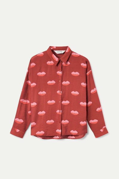 Shirt in lightweight crepe fabric with a lips print. Lapel collar and long sleeves with buttoned cuffs. Front button closure. Slightly dropped shoulders. The model is 177 cm tall and is wearing a size S.