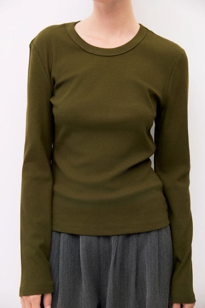 The Kathy Top is a slim-fit long-sleeved tee made from midweight ribbed knit. It features a classic crewneck and long sleeves for a clean, simple look. Perfect for layering or wearing on its own.