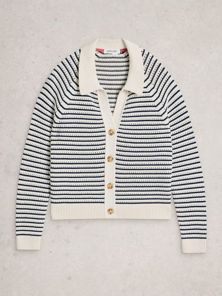 A soft textured knit, a nautical stripe, a smart white collar. The Chaterly cardi has it all. And plenty more besides. It’s made with 100% organic cotton, perfect for spring layering. Team it with wide leg jeans and statement shoes for weekend jaunts to the coast.