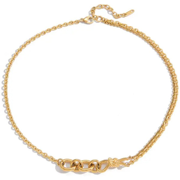 Double know is the mix of a loop carved knot or ribbon and Muti links. With double up chain. Knot details are long part of jewelry from bows to ribbons. This is a vintage casting we made modern using steel.