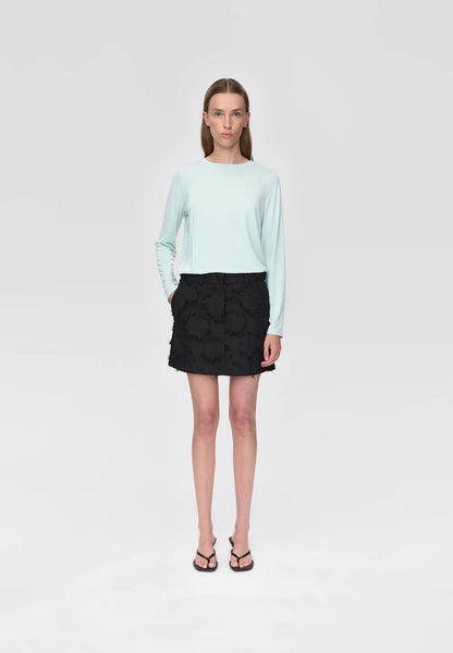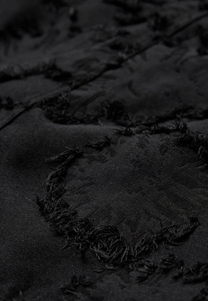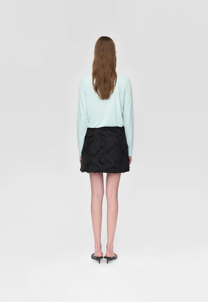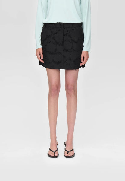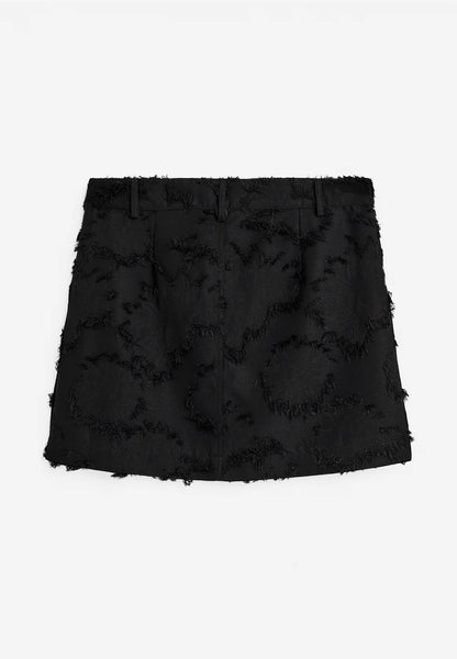 Short mid waist skirt made from a flower fringed jacquard fabric. Featuring fly closure at front, belt loops and pockets at side seam. Style is fully lined.