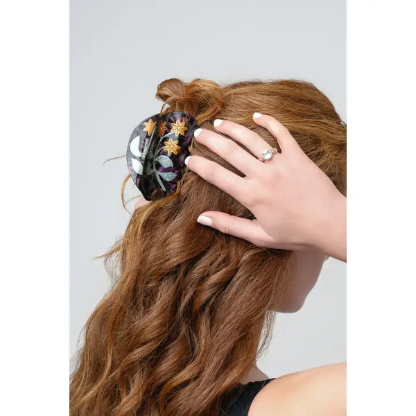 Our Lady’s mantle claw features silvery green leaves dripping in crystal dew, topped by golden star shaped booms, and encompassed by a swirling golden burgundy acetate.