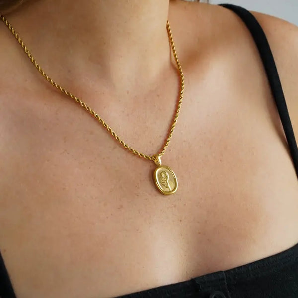 Sunflowers always face the sun, and you do too! The gold-plated finish gives it a distinct embossed look and guarantees it as an amazing everyday necklace. A twisted rope chain gives this floral necklace an added baroque edge.