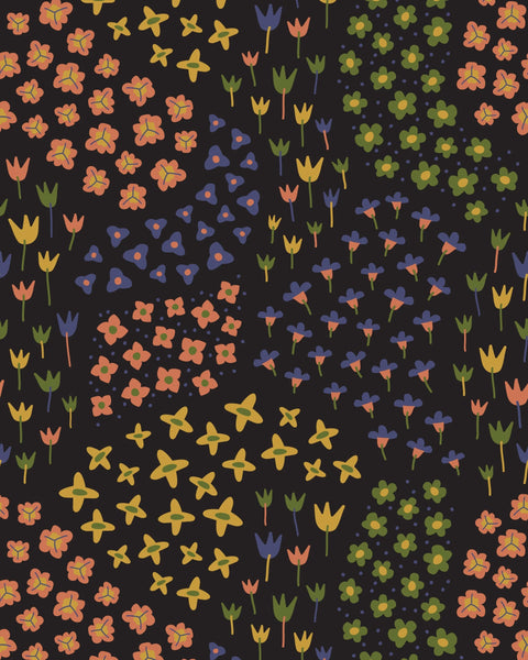 The Micro Floral Field Print is a delicate tapestry of charming blooms scattered across a rich, dark canvas, capturing the beauty of a midnight meadow. Here's an analysis of how this whimsical print uplifts mood, enhances self-expression, and fosters a connection to nature:
