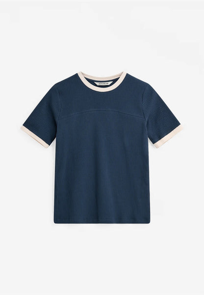 Retro inspired ribbed t-shirt with contrast edges along neckline and sleeve hem. Combine it with tailored trousers to add a more sporty element to your look.