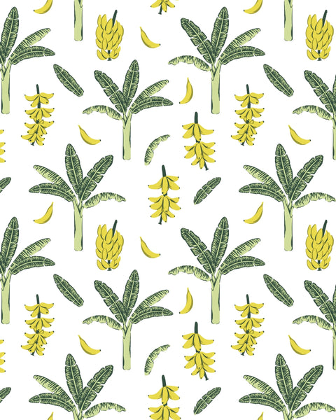 The hand-drawn banana palms and floating fruit lend a relaxed, easygoing charm, perfect for those who love nature-inspired prints with a touch of whimsy.