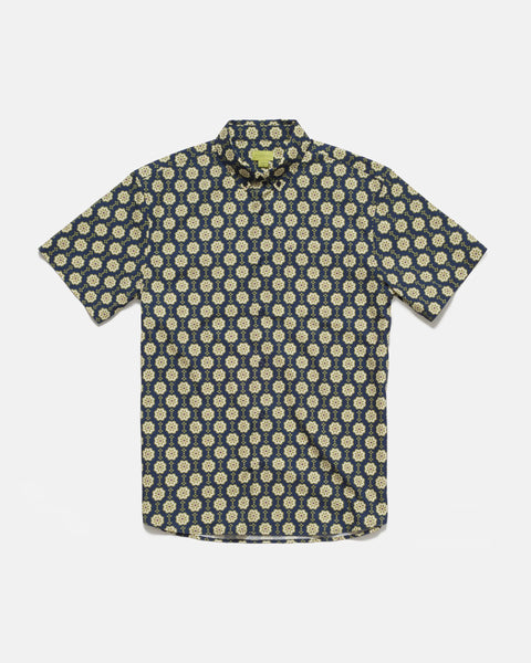 Discover our hand-drawn Spanish Tile Print Shirt, crafted from 100% Peached Cotton using a durable Poplin weave. This woven true-fit shirt is made in limited quantities to reduce our environmental impact and to increase exclusivity for our customers. It features a button-down collar, button front, short sleeves, and a curved hem. Pre-shrunk for convenience, it remains smooth after machine washing ensuring the perfect fit and an incredible feel from the moment you put it on. The hand-drawn block print is art to wear and adds a touch of casual elegance to your wardrobe.