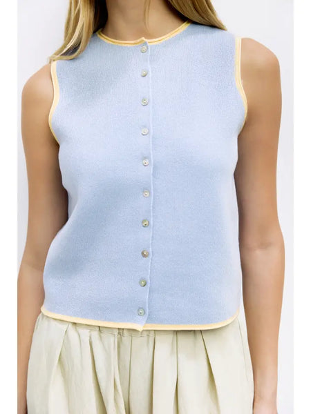 The Lisa Top is a versatile layering piece in midweight nylon-blend knit. Its relaxed fit and full button front are elevated by a contrast crewneck and armhole trim for a modern touch.
