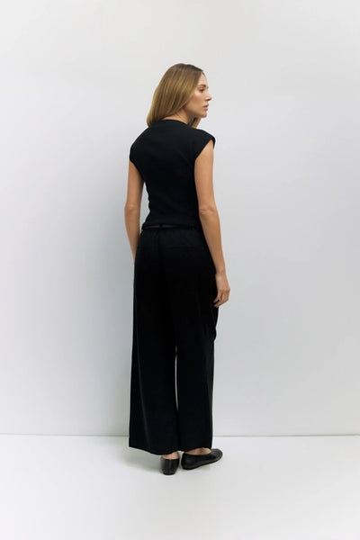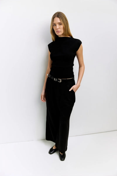 The Lori Top is crafted from a midweight blend of polyester, acrylic, modal, and nylon, featuring a wide neckline, cap sleeves, and a form-fitting silhouette.