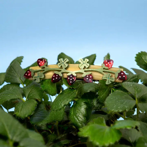 This French barrette features a branches of strawberries, and opalescent pink stones for a dreamy, fantastical look.
